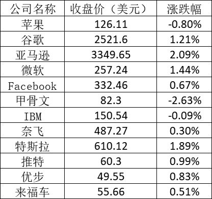 大型科技股普遍上漲,其中Google和微軟股價上漲1%以上,亞馬遜股價上漲2%以上;蘋果股價逆勢下跌,但跌幅不到1%。