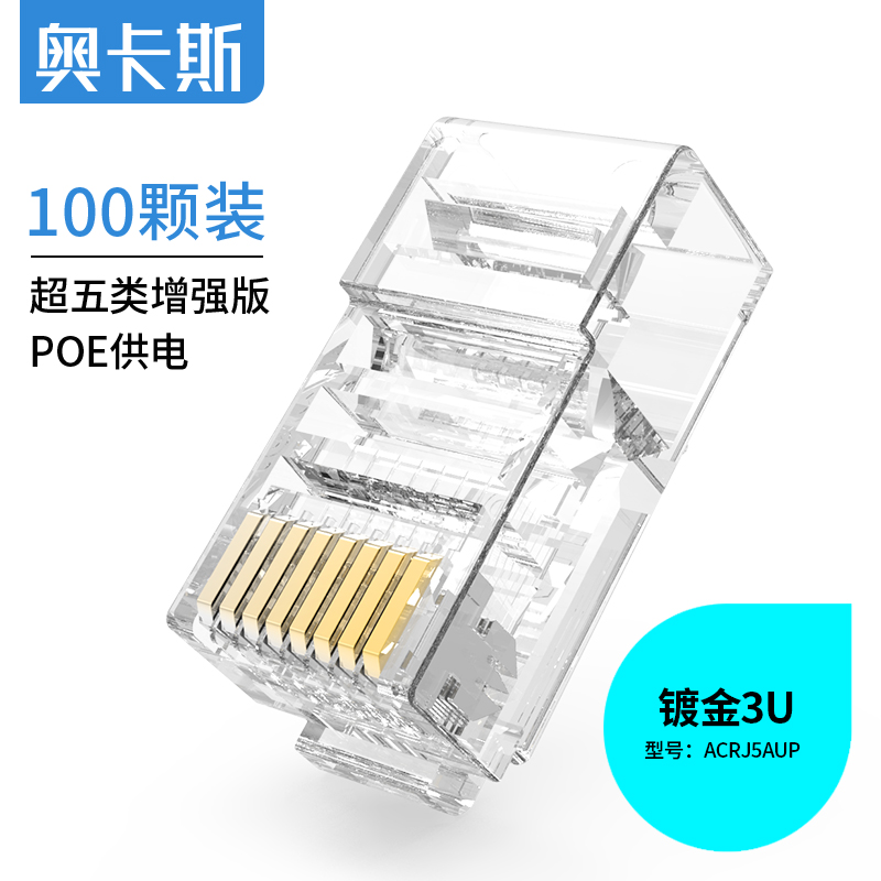 奧卡斯超五類水晶頭傳輸性能超過超五類標(biāo)準(zhǔn);采用優(yōu)質(zhì)阻燃PC料, 阻燃符合UL94V-2,安全可靠;50μ鍍金針片,抗氧化,抗老化能力強,阻抗超低;接線更牢靠,傳導(dǎo)性更強,不易脫落,與模塊接觸使衰減降至最低程度