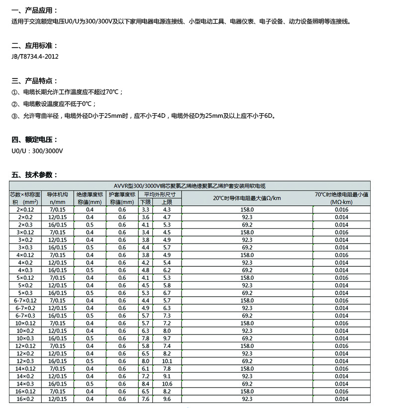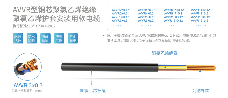 適用于交流額定電壓U0/U為300/300V及以下家用電器電源連接線、小型電動工具、電器儀表、電子設(shè)備、動力設(shè)備照明等連接線