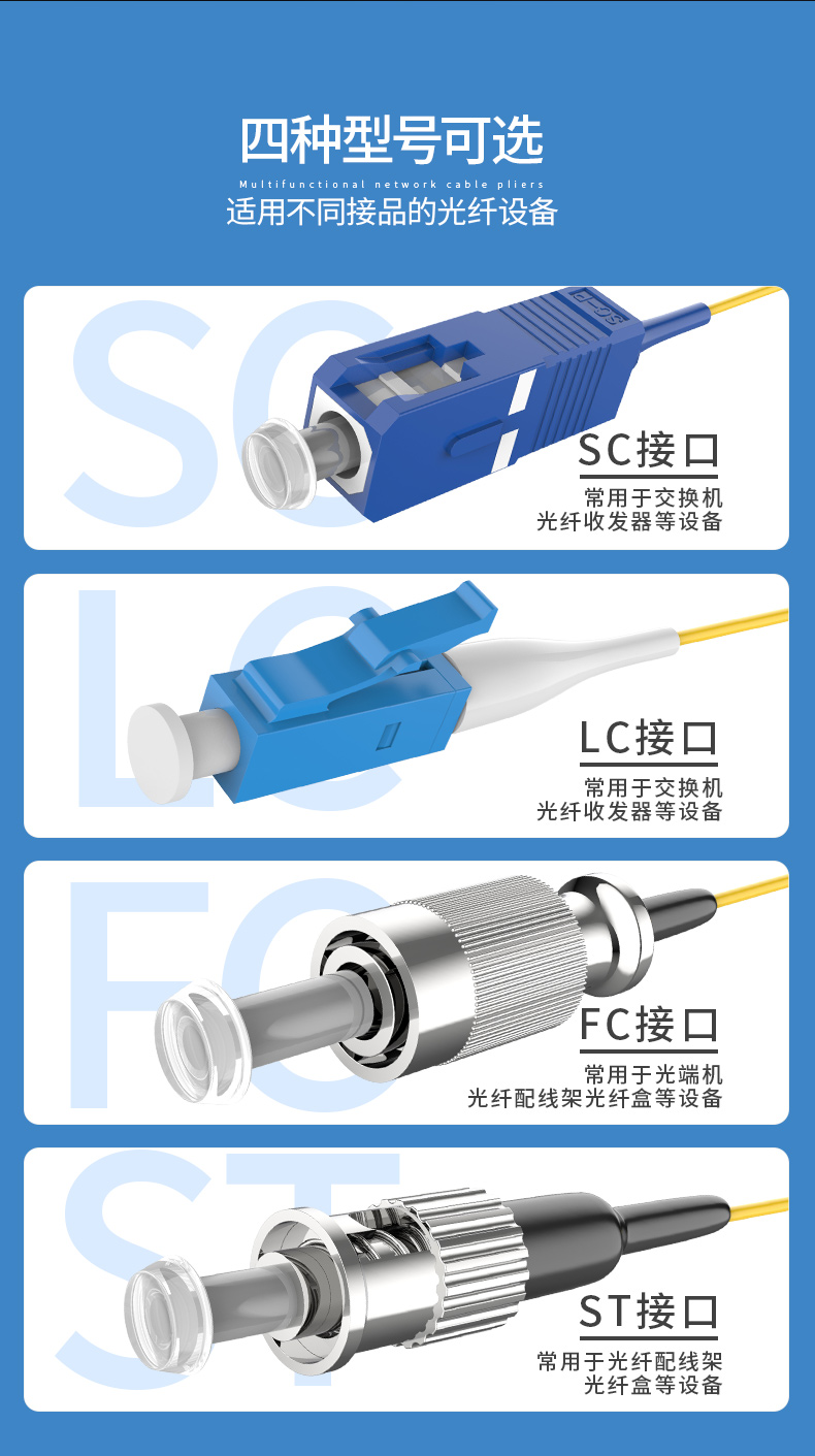 奧卡斯單模、多模 光纖 尾纖用于連接光纜,可使冷、熔等方式。 具有多種接頭形式, 光纖接頭的端面觸方式有UPC和 APC 型。可達(dá)萬兆傳輸。