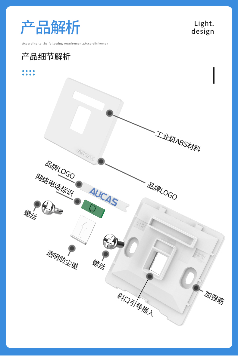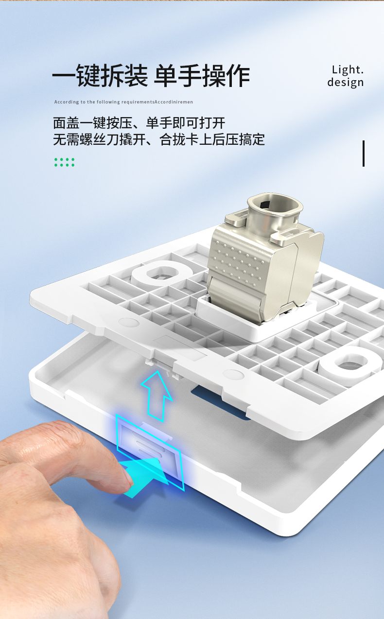 適用于各類網(wǎng)絡(luò)工程,辦公,居家使用,斜口引導(dǎo)插入,更顯美觀,可安網(wǎng)絡(luò)信息模塊RJ45接口、語音RJ11電話模塊和CATV有限電視模塊安裝,拆卸方便。