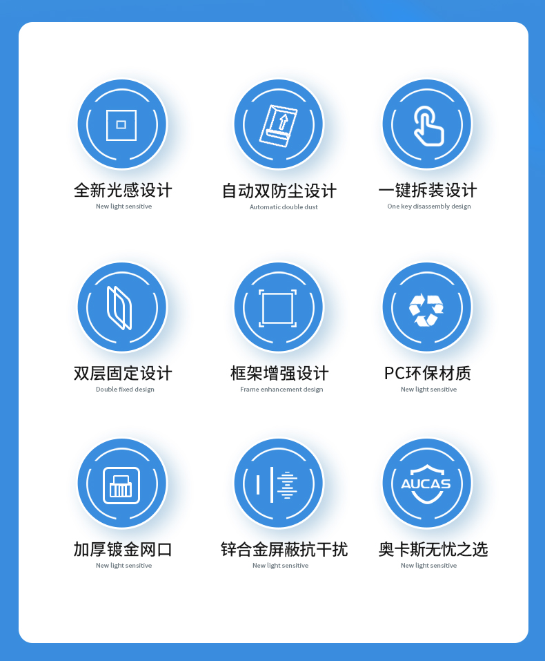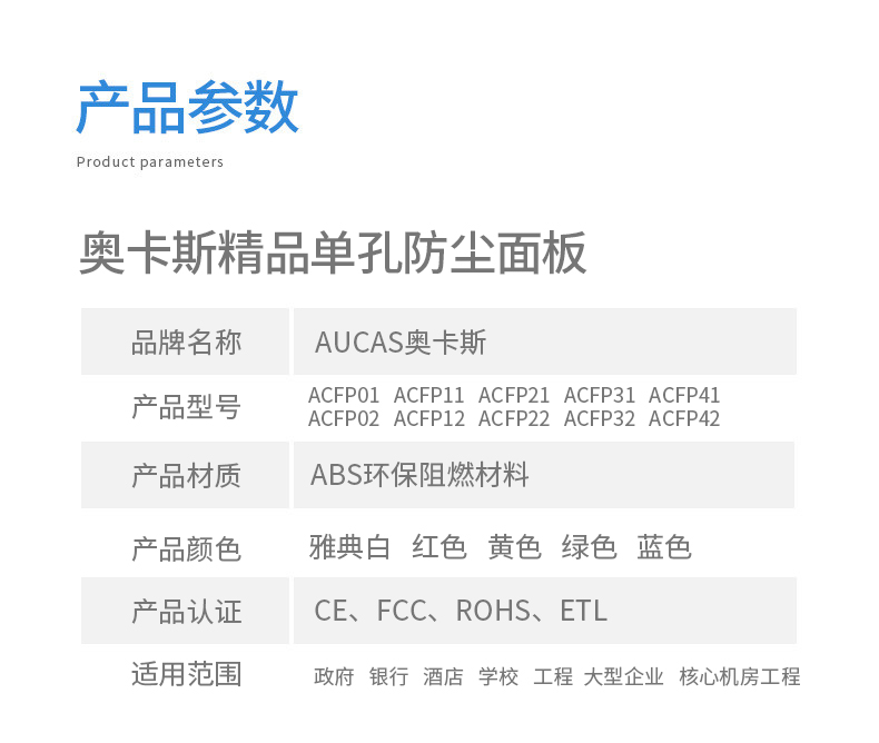 奧卡斯網(wǎng)絡(luò)信息面板嵌入式面框,安裝方便,便于識(shí)別數(shù)據(jù)和語音端口;防塵滑門用以保護(hù)模塊、遮蔽灰塵和污物進(jìn)入