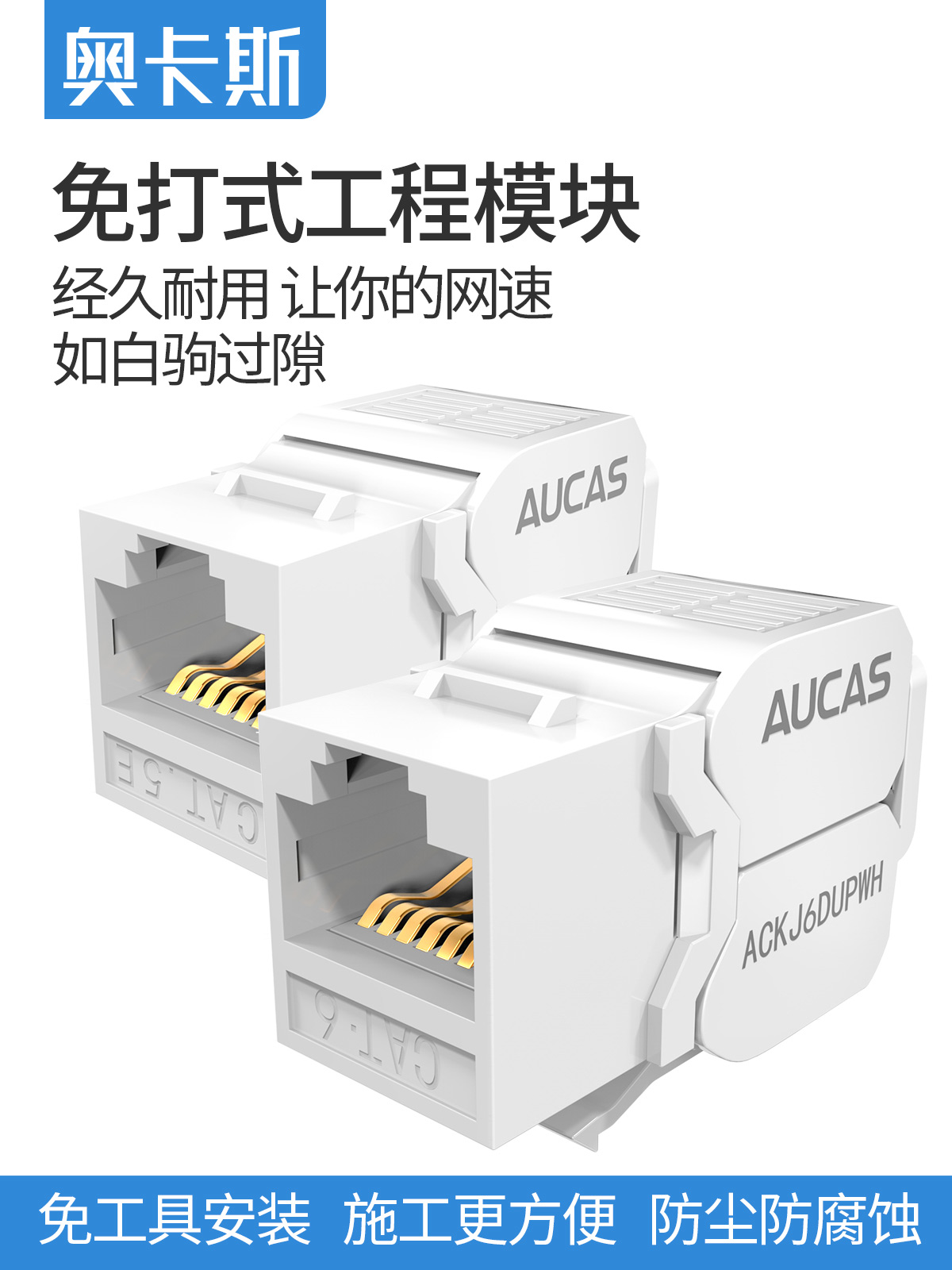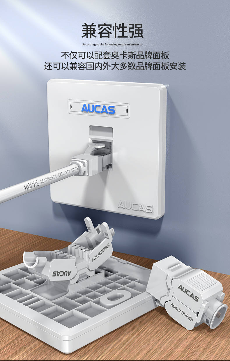 AUCAS(奧卡斯) Cat.6局域網(wǎng),傳輸語言、數(shù)據(jù)信號,支持當(dāng)前的高帶寬應(yīng)用,可以安裝到墻面信息面板上,固定在桌面信息盒中或模塊化配線架上,并可插拔RJ11/RJ45。