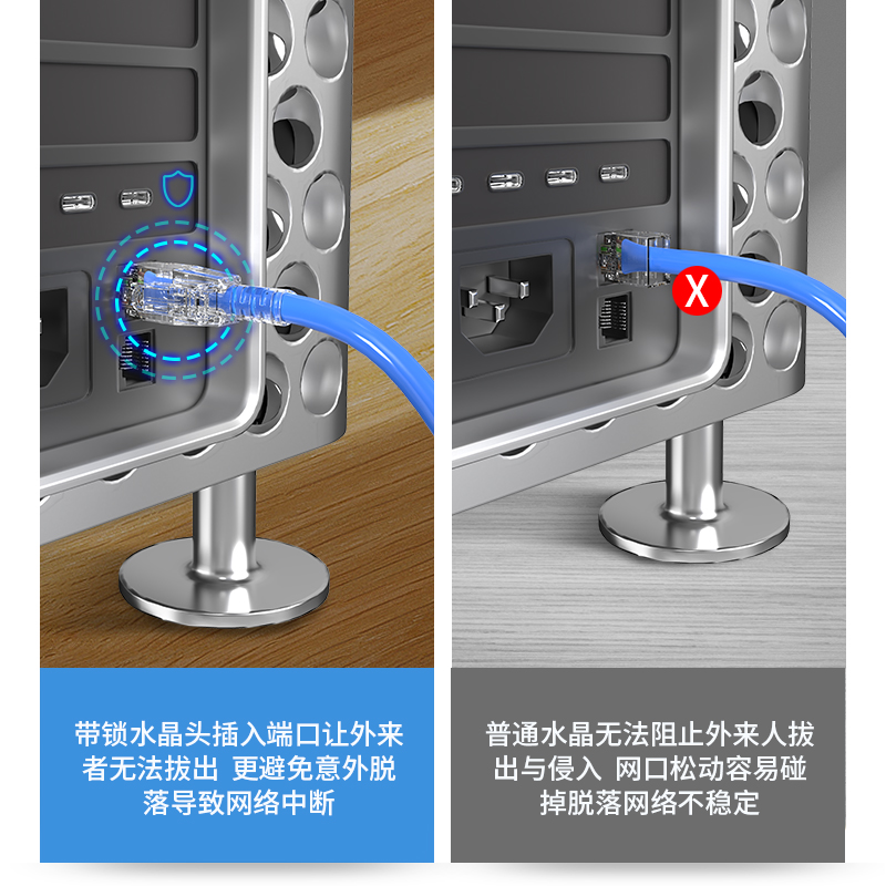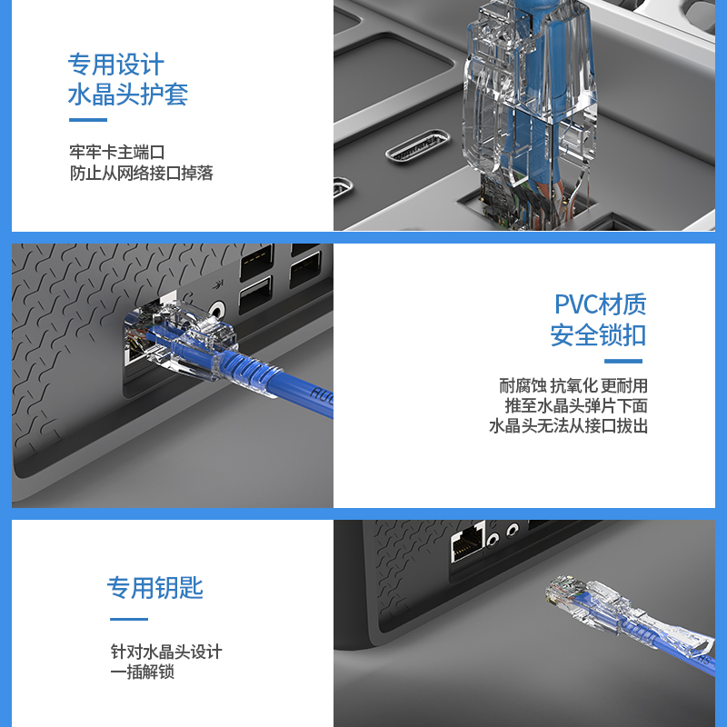 六類非屏蔽跳線主要作為監(jiān)控、語音、數(shù)據(jù)、多媒體等的傳輸載體,用于工作區(qū)插座與設(shè)備端口的連接,以及配線架或中心機(jī)房內(nèi)模塊插座與設(shè)備的連接。可應(yīng)用于教育、政府、安防、金融、醫(yī)療、酒店、高鐵等網(wǎng)絡(luò)設(shè)施,使用鎖扣式水晶頭可以有效的防止隨意拔出或隨意插入,保護(hù)每個端口的涉密性。