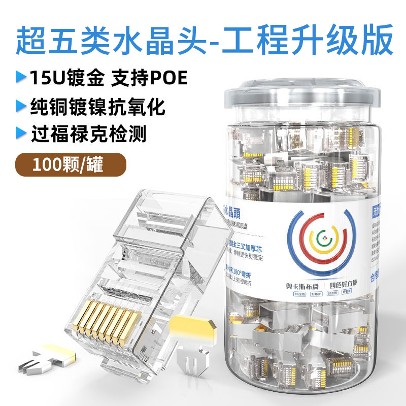 奧卡斯超五類(lèi)水晶頭傳輸性能超過(guò)超五類(lèi)標(biāo)準(zhǔn);采用優(yōu)質(zhì)阻燃PC料, 阻燃符合UL94V-2,安全可靠;50μ鍍金針片,抗氧化,抗老化能力強(qiáng),阻抗超低;接線(xiàn)更牢靠,傳導(dǎo)性更強(qiáng),不易脫落,與模塊接觸使衰減降至最低程度