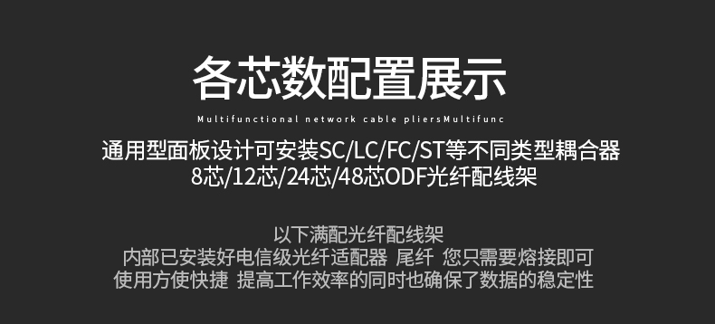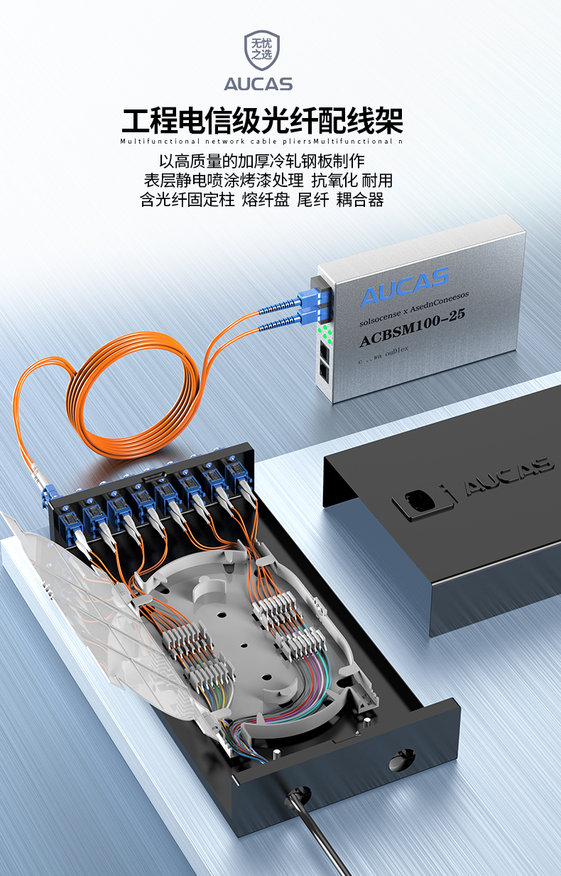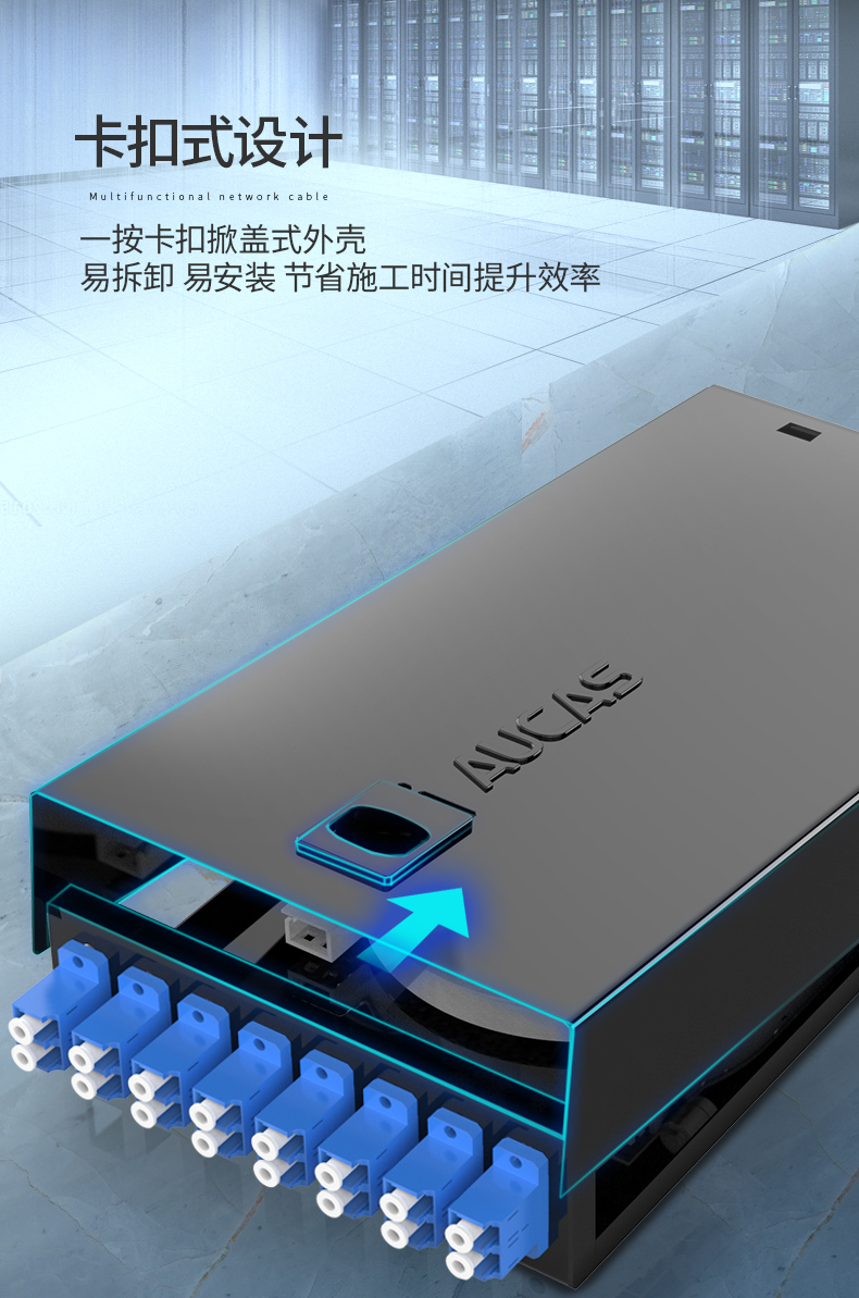 以高質(zhì)量的冷軋鋼板制作,表層靜電噴涂烤漆處理,外觀精美。通用型面板設(shè)計(jì),可安裝ST/ SC/ LC /FC等不同類型耦合器、易拆卸前蓋及上蓋扣設(shè)計(jì),免工具即可拆卸前蓋及上蓋板,裝卸更為容易