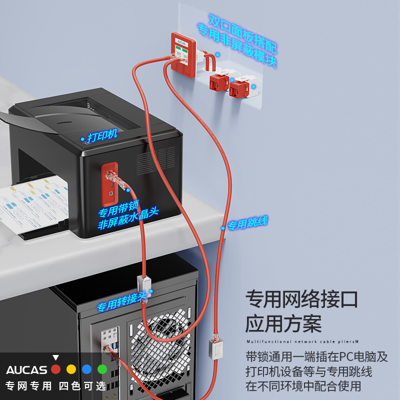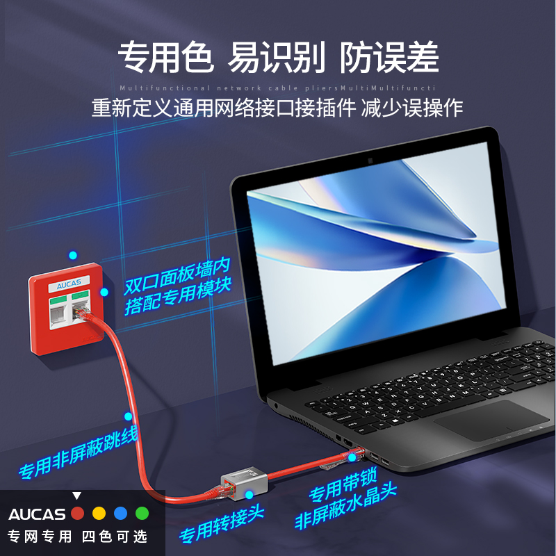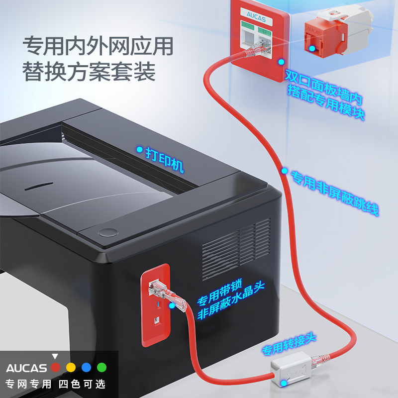 通過結構化設計調(diào)整將 RJ45 網(wǎng)絡模塊防塵蓋接口轉(zhuǎn)換成專用網(wǎng)絡接口,防止常規(guī)網(wǎng)絡跳線誤插RJ45 水晶頭搭配專用解鎖工具防止誤插拔功能,需專用解鎖工具方可取下專用網(wǎng)絡轉(zhuǎn)接頭轉(zhuǎn)接頭及連接器間線纜可提供紅、黃、藍、綠四種顏色選擇方便從顏色識別網(wǎng)絡信息系統(tǒng)