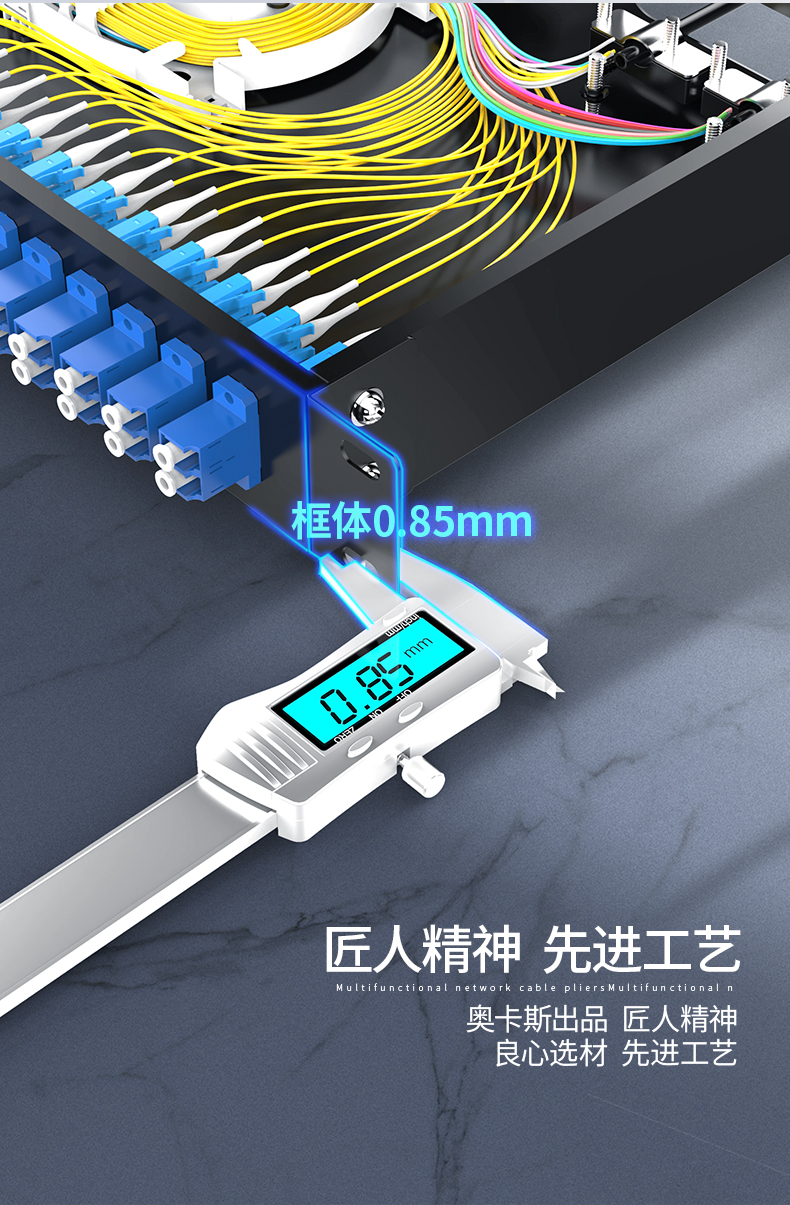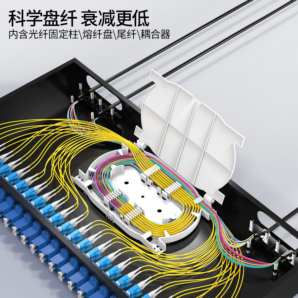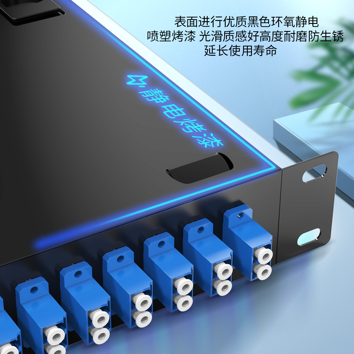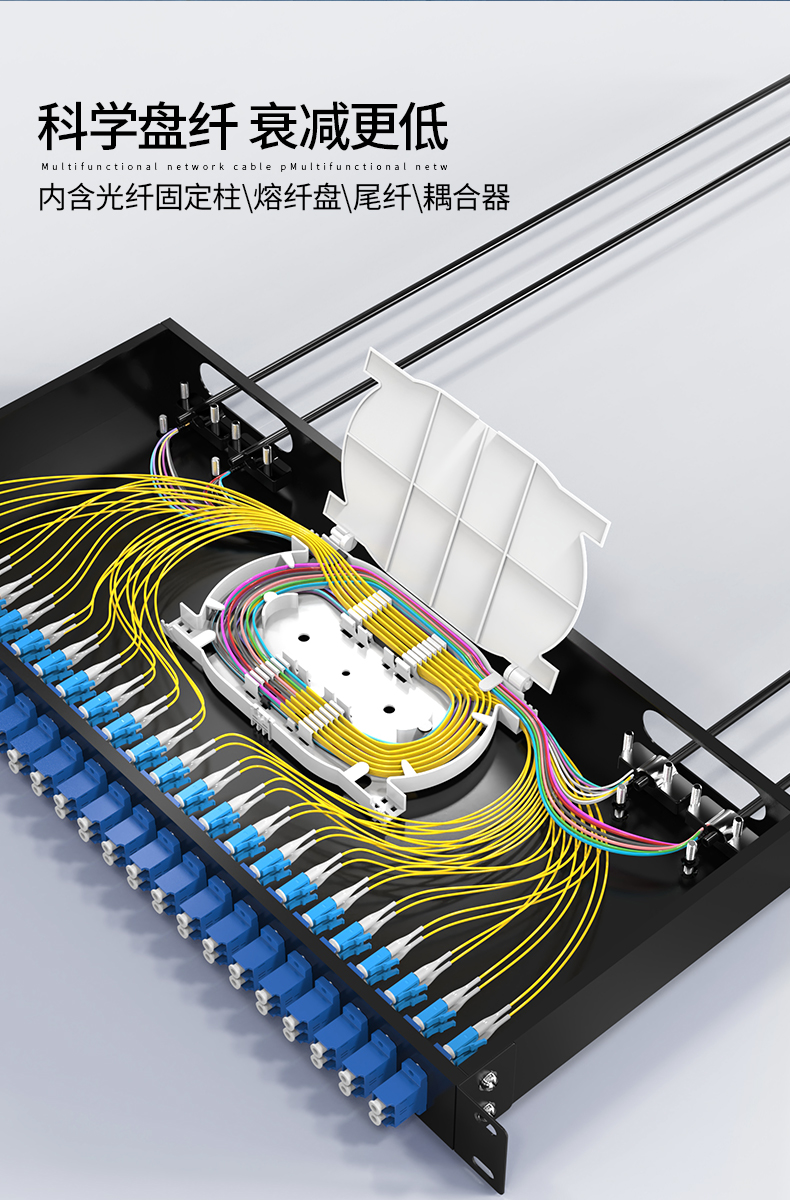 以高質(zhì)量的冷軋鋼板制作,表層靜電噴涂烤漆處理,外觀精美。通用型面板設(shè)計(jì),可安裝ST/ SC/ LC /FC等不同類型耦合器、易拆卸前蓋及上蓋扣設(shè)計(jì),免工具即可拆卸前蓋及上蓋板,裝卸更為容易